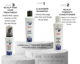- Scalp Cleanser Shampoo: Removes dirt, excessive oil, and other environmental residues from scalp and hair, to prepare for thickening treatment.
